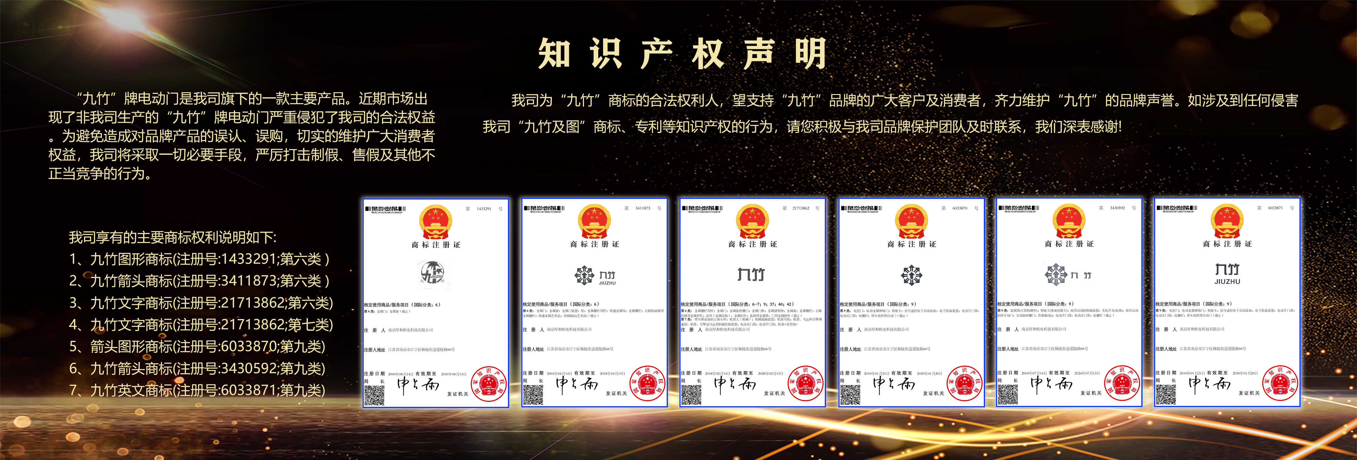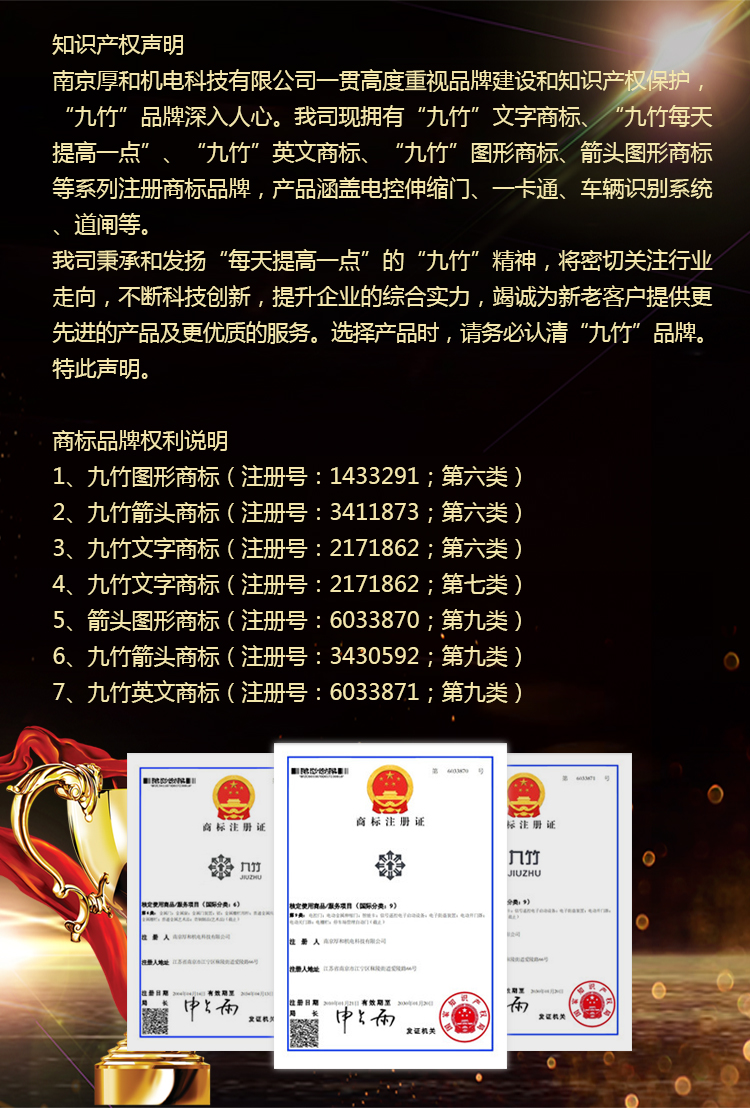 南京厚和機電科技有限公司是一家以生產電動門及停車場管理系統為主的綜合性企業,注冊資本2000萬元,注冊生產的“九竹”牌電動門相繼被評為“南京名牌產品(2013.2-2016.2)”與“江蘇省名牌產品(2013.12-2016.12)”;“九竹”牌停車場管理系統被南京市人民政府評為“南京名牌產品”、江蘇省科學技術廳評為高新技術產品。